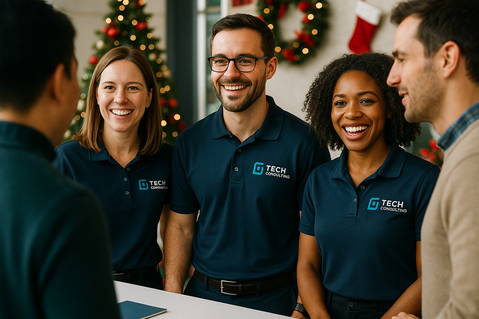 Tech teams wearing event polos for holiday expos chatting casually with other event attendees