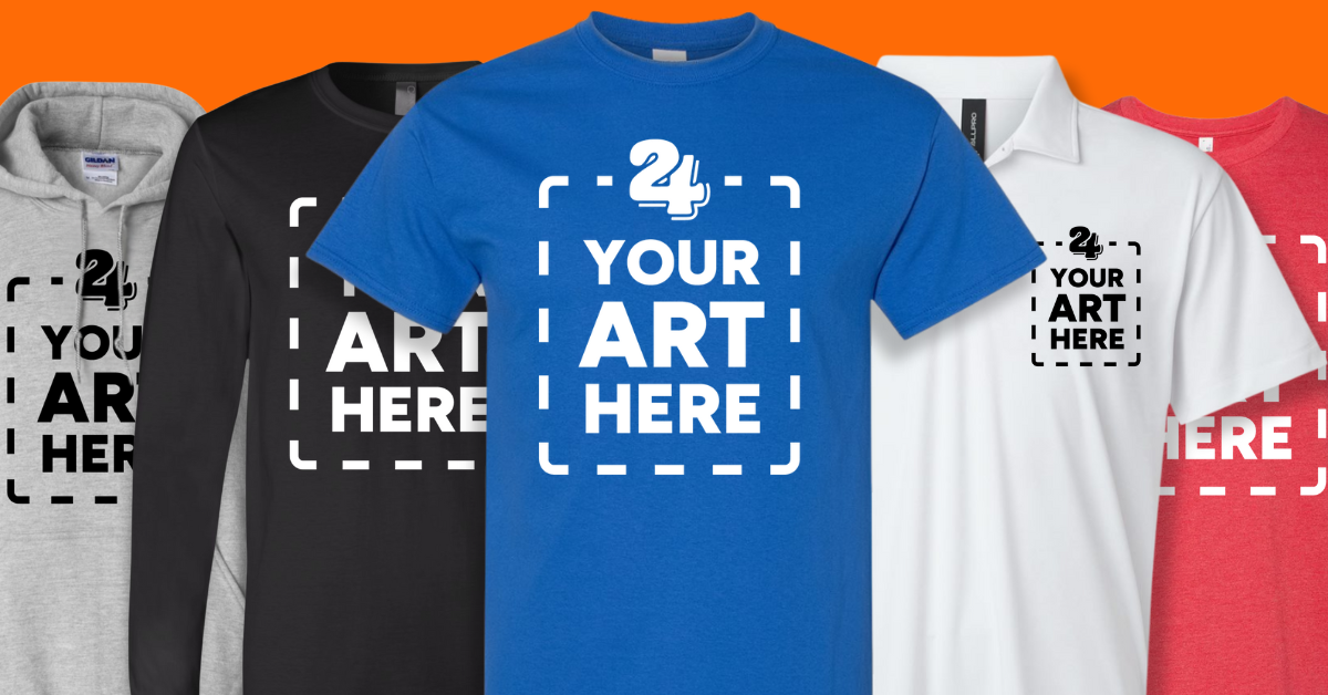 crazy fast custom shirts, hoodies, polos, and long sleeves with a custom "your art here" screenprinting graphic in white ink