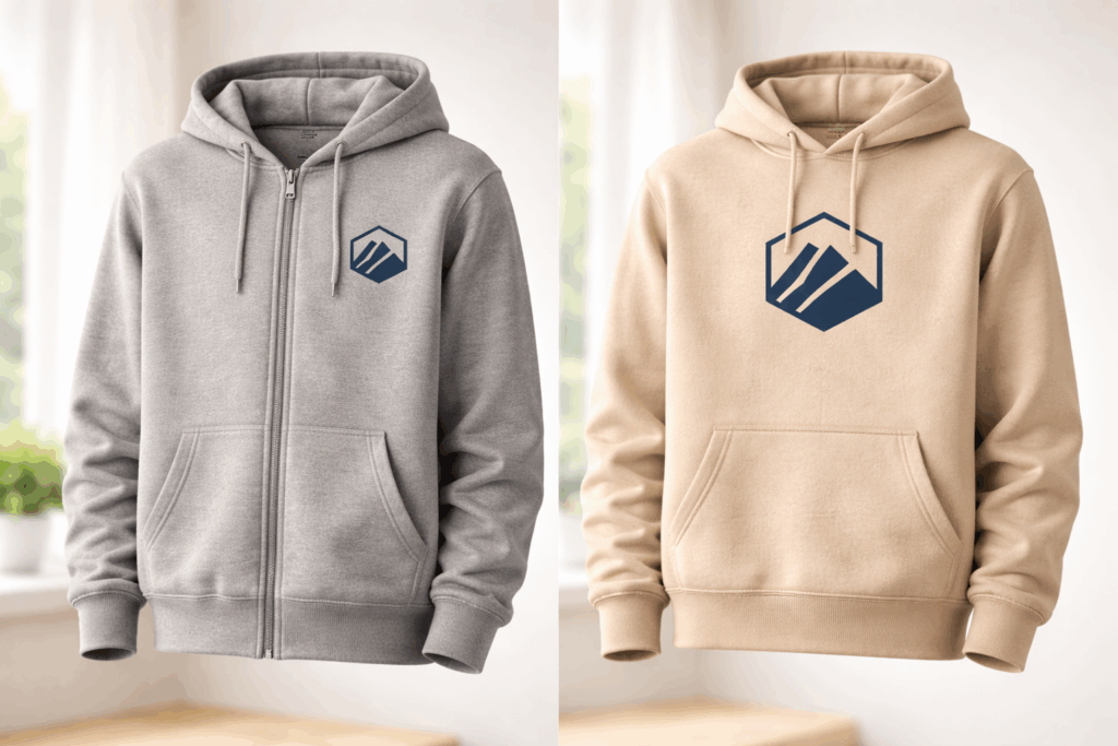 - Placement adjustments: For zip ups, the design might move to the left chest to avoid the zipper. For pullovers, you might use a larger centered design.